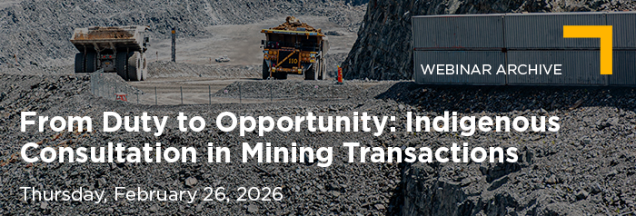 Join members of our Capital Markets Group and Indigenous Practice Group for a practical discussion on legal obligations, governance considerations and best practices that support compliant, sustainable and successful mining operations.